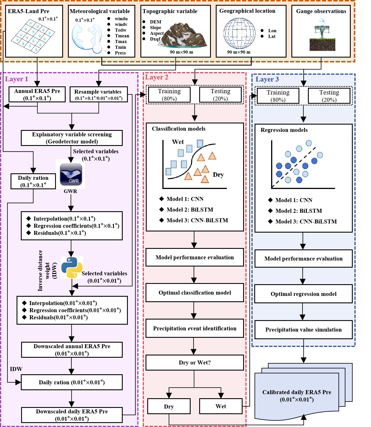 TLIDC技術框架。TLIDC框架整體分為三部分:降水數據的空間降尺度(表示為Layer 1)、降水事件的識別(表示為Layer 2)和降水量的模擬(表示為Layer 3)。Layer 1通過GWR模型,提供高空間分辨率的降水數據,Layer 2和Layer 3利用構建的CNN-BiLSTM模型來提高降尺度后降水數據的準確性