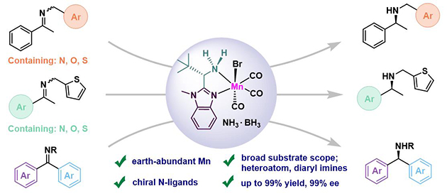 近日,中國科學(xué)院蘭州化學(xué)物理研究所低碳催化與二氧化碳利用全國重點實驗室仿生催化與低碳化學(xué)組,在前期發(fā)展的錳催化不對稱轉(zhuǎn)移氫化反應(yīng)的基礎(chǔ)上 (ACS Catal.,2021,11,8033-8041;J. Catal.,2022,413,487-497;J. Catal.,2024,438,115680),在含雜原子(N,O,S)亞胺和雙芳基亞胺的不對稱轉(zhuǎn)移氫化反應(yīng)取得了新進展。