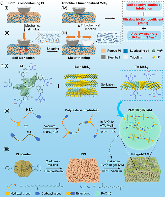 近期,中國科學院蘭州化學物理研究所潤滑材料全國重點實驗室王道愛研究員團隊基于"自適應限域潤滑"的策略(圖1),設計制備了MoS2-油凝膠復合的多孔聚酰亞胺(PPI-gel-TAM),具有高的儲油能力(18.2%)和油保持率(97.7%),實現(xiàn)了鋼/PPI界面自適應的宏觀超潤滑(摩擦系數(shù):~0.007)和超低的磨損率(2.81×10-8·mm3·N-1·m-1),展現(xiàn)出出色的摩擦學性能,為未來發(fā)展高性能的工程極限潤滑材料提供了新的見解和思路。