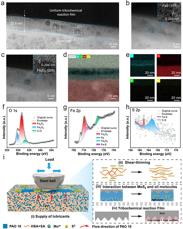 鋼/PPI界面宏觀超潤滑機理可歸因于四種機制的耦合作用,多孔結構的儲油/釋放、潤滑劑的剪切變稀特性、功能化的二硫化鉬與油分子之間的相互作用以及摩擦保護膜的形成(圖2)。