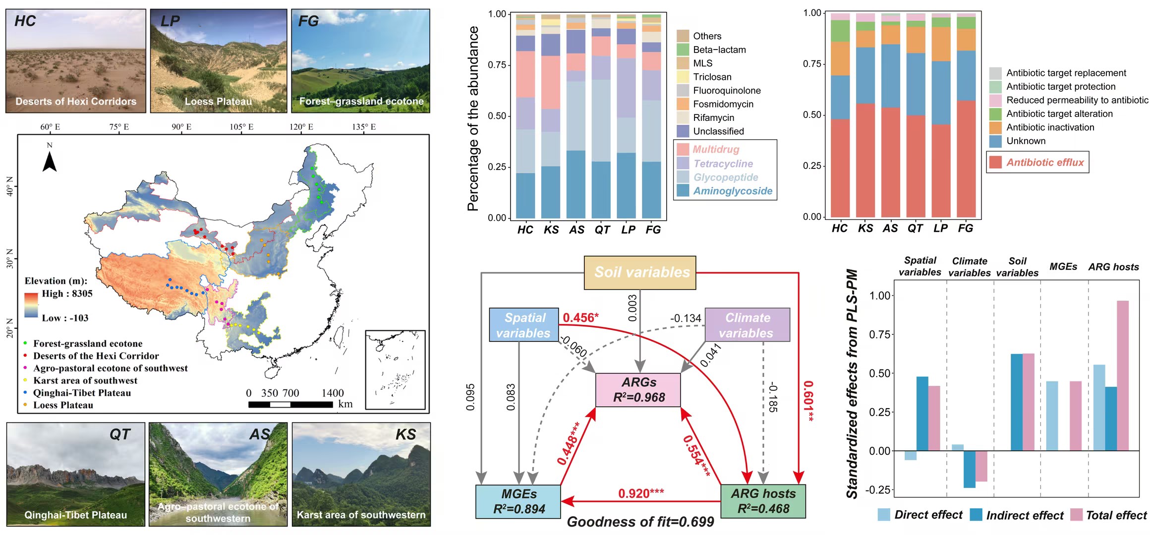 中國科學(xué)院西北生態(tài)環(huán)境資源研究院李玉強(qiáng)研究員團(tuán)隊(duì)在我國4300公里的范圍內(nèi),針對(duì)森林、草原、沙漠等六類典型陸地自然生態(tài)系統(tǒng),設(shè)立了42個(gè)采樣點(diǎn),運(yùn)用宏基因組學(xué)方法,系統(tǒng)揭示了表層土壤中ARGs的分布特征與傳播機(jī)制。