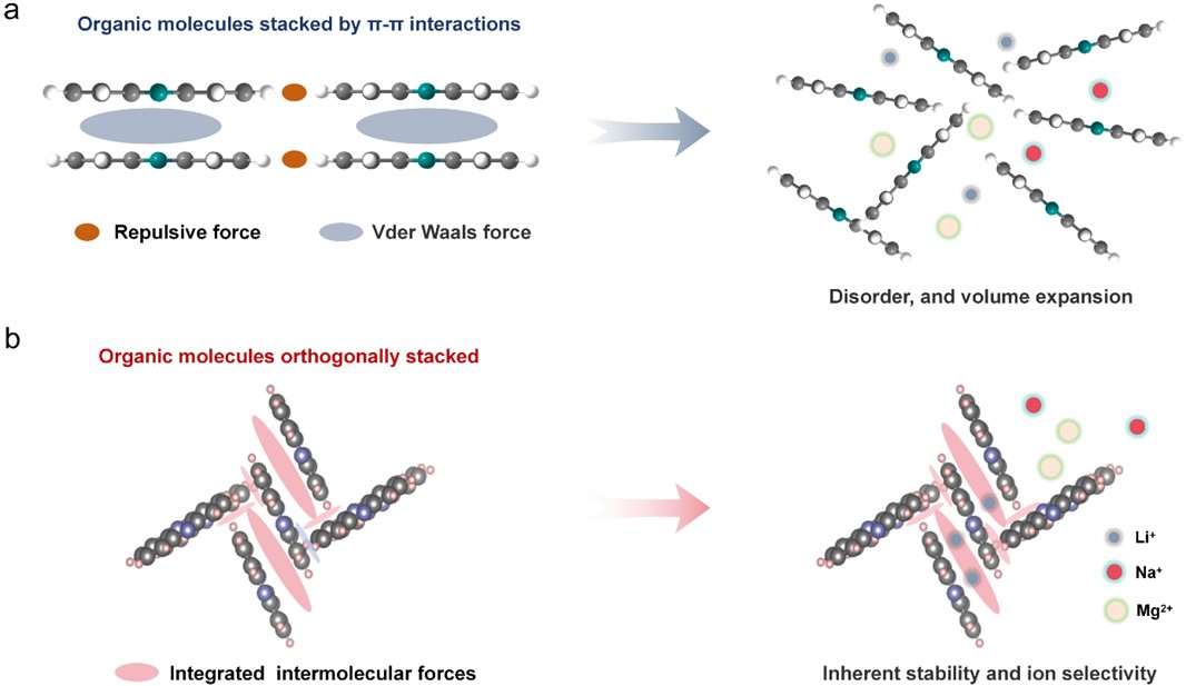 針對高容量有機(jī)小分子電極因離子插層體積膨脹導(dǎo)致結(jié)構(gòu)坍塌失穩(wěn)的科學(xué)挑戰(zhàn),研究團(tuán)隊(duì)開創(chuàng)性地提出基于分子間作用力網(wǎng)絡(luò)構(gòu)筑穩(wěn)定晶體結(jié)構(gòu)的新思路。以吩嗪為模型體系,研究證實(shí)正交垂直的分子堆疊方式可形成強(qiáng)分子間作用力網(wǎng)絡(luò)和具有離子選擇性的納米孔道。該結(jié)構(gòu)不僅能有效抑制體積膨脹帶來的機(jī)械失效問題,同時其產(chǎn)生的親鋰孔道在原子尺度對單價金屬離子(Li)具有優(yōu)先傳輸與選擇性性能,選擇性提鋰容量高達(dá)109 mg/g。該工作原創(chuàng)性地揭示了分子堆疊微結(jié)構(gòu)與電極材料的宏觀電化學(xué)穩(wěn)定性和離子選擇性之間的內(nèi)在物理化學(xué)規(guī)律,為設(shè)計(jì)新一代兼具高穩(wěn)定性、高選擇性、高通量的有機(jī)電化學(xué)離子捕獲材料奠定了重要理論基礎(chǔ)。