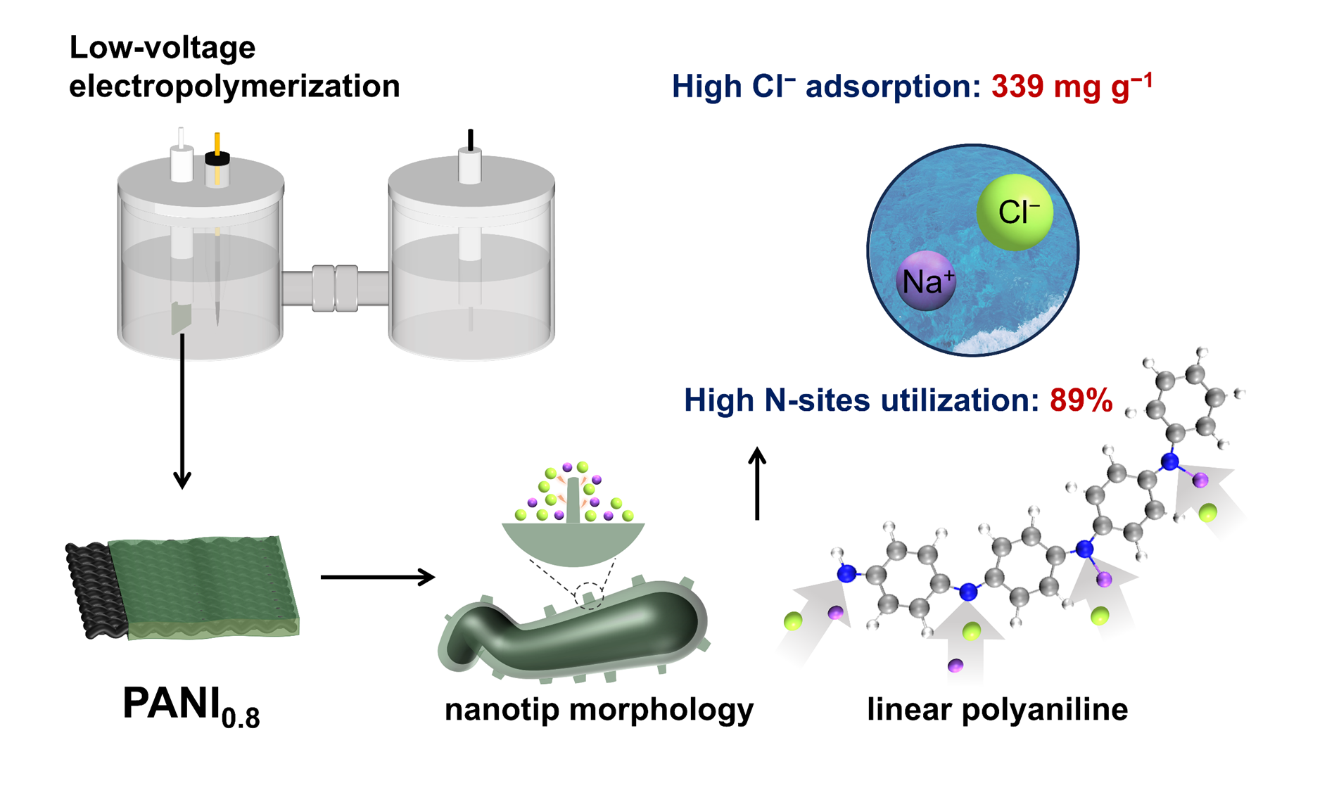 在鹵水資源電化學(xué)提取過程中,需兼顧電中性原則,因此高效提取伴生陰離子同樣重要。聚苯胺(PANI)憑借優(yōu)異的導(dǎo)電性和可逆摻雜特性,廣泛應(yīng)用于能源存儲、環(huán)境凈化和離子分離等領(lǐng)域。然而,傳統(tǒng)PANI因氮活性位點(diǎn)利用率低、微宏觀構(gòu)效關(guān)系不明確等問題,限制了其在高性能電化學(xué)脫鹽中的應(yīng)用。研究團(tuán)隊(duì)創(chuàng)造性發(fā)現(xiàn)聚合電位是調(diào)控其微觀結(jié)構(gòu)(如聚合度、鏈結(jié)構(gòu)、缺陷類型)的關(guān)鍵參數(shù)。通過原位電化學(xué)光譜等手段論證,采用“低電位”策略可有效抑制偶聯(lián)副反應(yīng),制備出含納米尖端的低聚度線性結(jié)構(gòu)聚苯胺。該獨(dú)特結(jié)構(gòu)顯著提升了含氮位點(diǎn)的暴露效率和可接近性:實(shí)現(xiàn)突破性高容量氯離子吸附(Cl容量達(dá)339 mg/g)和鈉離子吸附(142 mg/g)。該工作顯著推動了結(jié)構(gòu)可控聚合物的設(shè)計(jì)及其在電化學(xué)分離中的應(yīng)用。