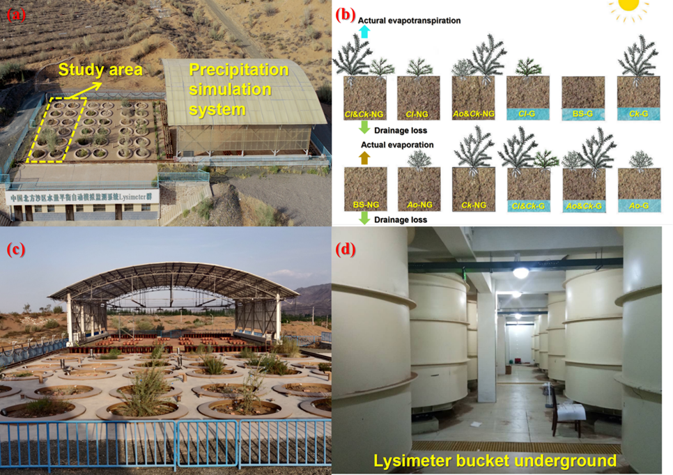 中國科學(xué)院西北生態(tài)環(huán)境資源研究院張志山研究員團隊,依托沙坡頭沙漠研究試驗站的“中國北方沙區(qū)水量平衡自動模擬監(jiān)測系統(tǒng)——沙坡頭蒸滲儀(Lysimeter)群”,采用其中12個大型稱重式蒸滲儀(填充土壤為騰格里沙漠的風(fēng)沙土,從裸沙到多種單一栽植及灌木與半灌木混合栽植),系統(tǒng)量化了2019年至2023年間不同沙漠生態(tài)系統(tǒng)(有無地下水)的水量平衡組分及植物生長動態(tài)。