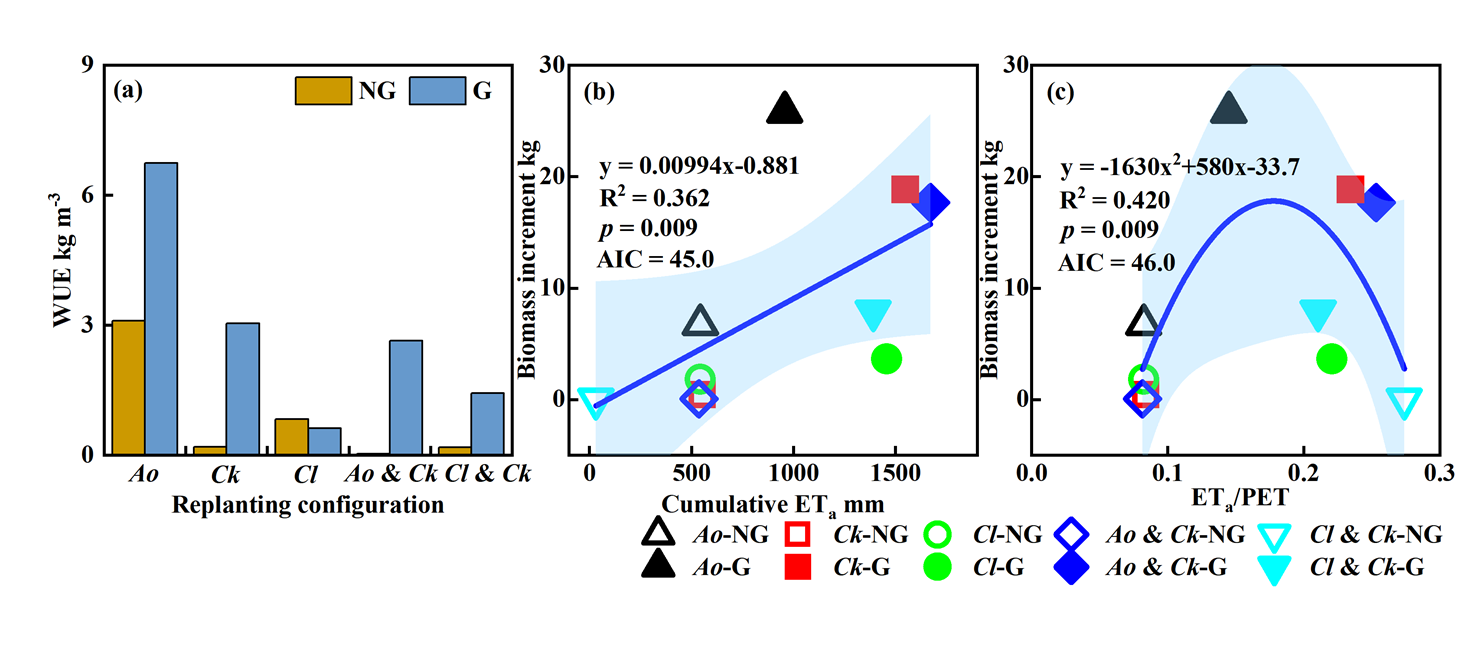 2020-2023年兩種地下水條件及不同植物配置下的水分利用效率(a),以及植物生物量增量變化與累積實際蒸散量 (b)和ETa/PET(c) 的關(guān)系。藍色陰影表示95%置信區(qū)間,PET:潛在蒸散發(fā)。