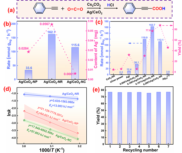 圖1. CO2與端炔羧化反應(yīng)(a)的催化活性(b、c)、活化能(d)和循環(huán)性能(e)研究