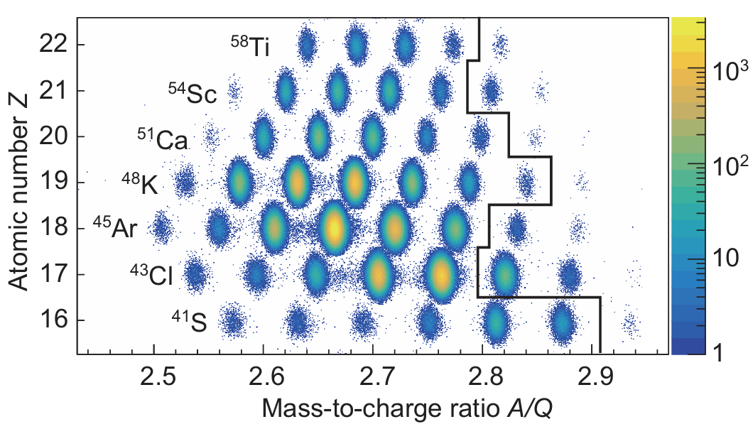 圖1:本次實(shí)驗(yàn)的原子核二維粒子鑒別圖。圖中黑色實(shí)線右側(cè)為本工作首次測(cè)量半衰期的原子核