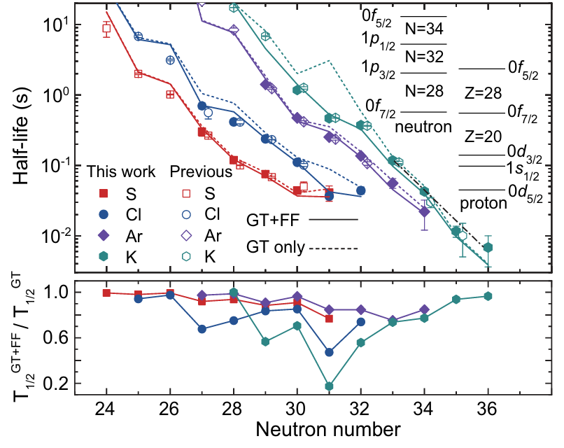 圖2:上圖:豐中子S、Cl、Ar和K同位素的β衰變半衰期系統(tǒng)性。實(shí)心符號(hào)表示本次實(shí)驗(yàn)的測(cè)量值,空心符號(hào)為文獻(xiàn)值。實(shí)線和虛線分別展示了同時(shí)包含GT和FF躍遷以及僅考慮GT躍遷的殼模型理論半衰期。黑色點(diǎn)劃線用以突出54K35半衰期的偏離系統(tǒng)性下降。相關(guān)的中子、質(zhì)子軌道顯示在了右上角。下圖:包含F(xiàn)F和GT躍遷的理論半衰期與僅考慮GT躍遷的理論半衰期之比