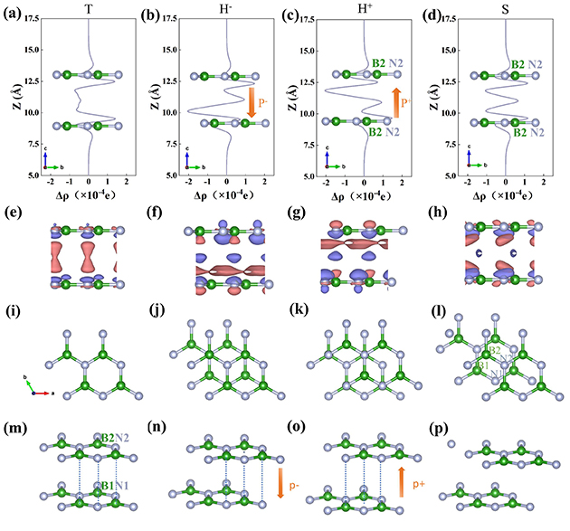 圖1.雙層h-BN的四種構(gòu)型對(duì)應(yīng)的一維(a-d)和三維(e-h)差分電荷密度以及構(gòu)型的頂視(i-l)和側(cè)視圖(m-p)。