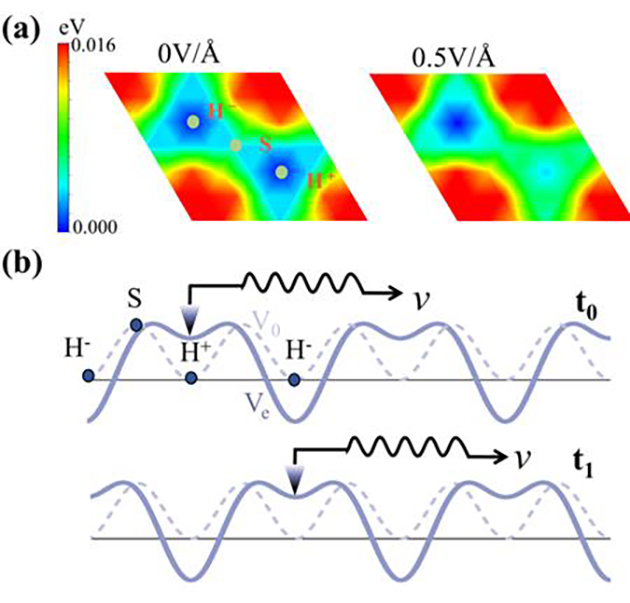 圖2. (a)不同電場(chǎng)下,雙層h-BN的摩擦勢(shì)能面;(b)系統(tǒng)沿最佳滑移路徑(H+→S→H-→S→H+)的勢(shì)能曲線,虛線和實(shí)線分別表示無外場(chǎng)和施加交變電場(chǎng)的結(jié)果。