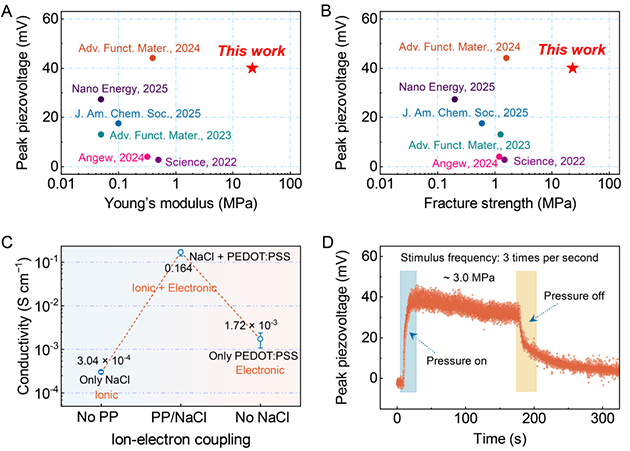 中國科學(xué)院蘭州化學(xué)物理研究所潤滑材料全國重點(diǎn)實(shí)驗(yàn)室摩擦物理與傳感課題組,通過優(yōu)化離電凝膠力學(xué)性能與離電性能的無縫兼容性,利用“分子?結(jié)構(gòu)正交設(shè)計(jì)”策略,首次在力學(xué)強(qiáng)韌的凝膠中實(shí)現(xiàn)了連續(xù)、穩(wěn)定的離子壓電效應(yīng)。