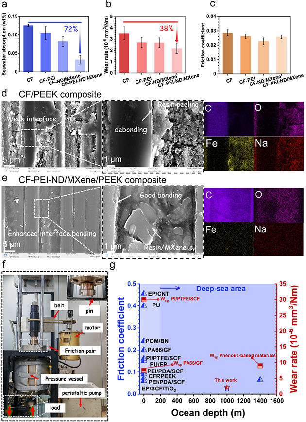 模擬深海高壓環(huán)境的原位摩擦磨損測(cè)試結(jié)果表明,這種有機(jī)/無(wú)機(jī)協(xié)同的界面設(shè)計(jì),能顯著提升復(fù)合材料在極端環(huán)境下的耐磨損性能(圖3)。在模擬1000米深海壓力下,制備復(fù)合材料的摩擦系數(shù)與磨損率均為目前文獻(xiàn)報(bào)道的同類材料最低值,為解決深海運(yùn)動(dòng)部件材料損傷防護(hù)與應(yīng)用提供了新思路。