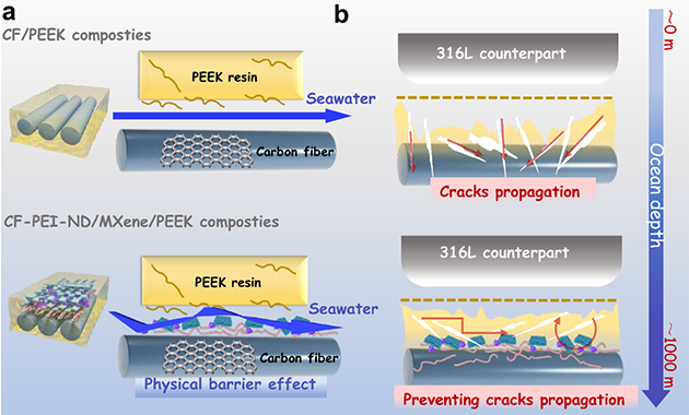 圖5.模擬深海環(huán)境下CF/PEEK復(fù)合材料增強(qiáng)潤(rùn)滑機(jī)制及強(qiáng)韌界面機(jī)制示意圖