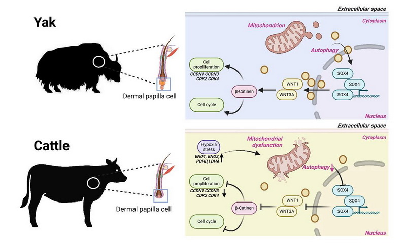 研究團(tuán)隊(duì)進(jìn)一步利用ATAC-seq與ChIP-qPCR發(fā)現(xiàn)了轉(zhuǎn)錄因子SOX4可直接結(jié)合WNT1WNT3A基因的啟動(dòng)子區(qū)域,且這一結(jié)合對(duì)基因的轉(zhuǎn)錄激活作用通過雙熒光素酶實(shí)驗(yàn)得到驗(yàn)證。SOX4的表達(dá)受自噬水平調(diào)控,激活自噬可挽救SOX4抑制劑對(duì)DP細(xì)胞增殖的抑制作用。該調(diào)控通路在牦牛體中表現(xiàn)出更強(qiáng)的信號(hào)活性,通過促進(jìn)DP細(xì)胞周期進(jìn)程、增強(qiáng)細(xì)胞增殖能力來維持毛囊穩(wěn)態(tài);同時(shí),該通路還能改善線粒體結(jié)構(gòu)完整性以抵御氧化應(yīng)激,從而可能促進(jìn)毛囊生長(zhǎng),系統(tǒng)性增強(qiáng)牦牛對(duì)高原寒冷環(huán)境的生存適應(yīng)能力??傊?,研究團(tuán)隊(duì)從單細(xì)胞水平解析了牦牛毛囊適應(yīng)高原寒冷環(huán)境的分子特征,為理解動(dòng)物對(duì)高原極端環(huán)境的適應(yīng)機(jī)制提供了重要基礎(chǔ)數(shù)據(jù)。