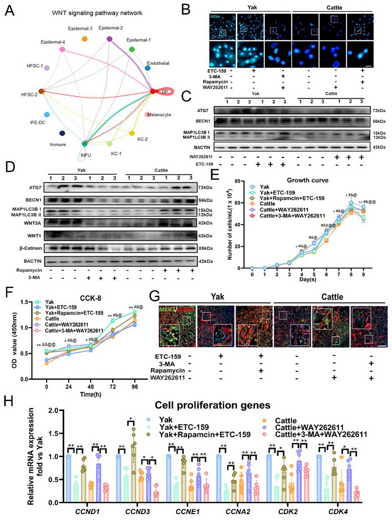 文章代表圖:DP細(xì)胞中自噬與增殖的相互作用由WNT/β-Catenin通路介導(dǎo)。(A)DP細(xì)胞單細(xì)胞數(shù)據(jù)中WNT信號(hào)通路的細(xì)胞相互作用圖。(B)不同處理后牦牛和普通牛DP細(xì)胞的MDA活細(xì)胞染色。(C)牦牛、牦牛+ETC-159、普通牛和普通牛+WAY262611處理組DP細(xì)胞中ATG7、BECN1和LC3I/II的蛋白質(zhì)印跡分析(n=3)。(D) 牦牛、牦牛+3-MA、普通牛和普通牛+雷帕霉素處理組DP 細(xì)胞中ATG7、BECN1、LC3I/II、WNT3A、WNT1和β-Catenin的蛋白質(zhì)印跡分析(n=3)。(E-F)牦牛、牦牛+ETC-159、牦牛+雷帕霉素+ETC-159、普通牛、普通牛+WAY262611和普通牛+3-MA+WAY262611組DP細(xì)胞的生長(zhǎng)曲線(n=9)和CCK-8檢測(cè)結(jié)果(n=4)。(G)不同處理組牦牛和普通牛DP細(xì)胞體外培養(yǎng)后PCNA和MKi67的代表性免疫熒光圖像(n=8)。(H)實(shí)時(shí)熒光定量PCR檢測(cè)細(xì)胞增殖相關(guān)基因CCND1、CCND3CCNE1、CCNA2、CDK2CDK4的mRNA表達(dá)情況(n=6)