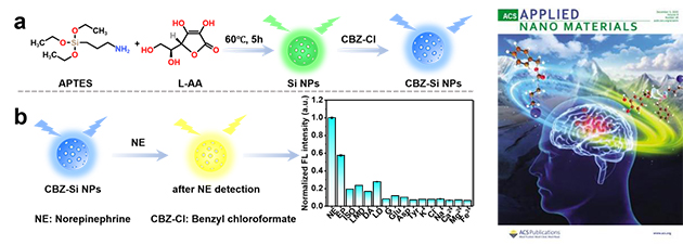 圖 2. a:CBZ-Si NPs的制備流程;b:NE的檢測示意圖;文章封面圖