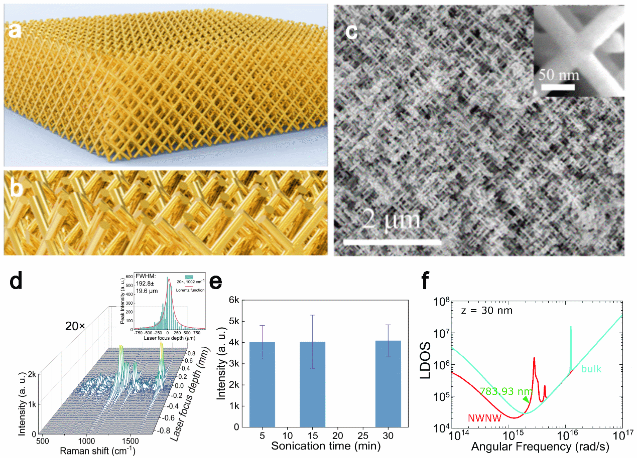 圖:具有聚焦容忍性和結(jié)構(gòu)穩(wěn)定性的三維金納米網(wǎng)格SERS襯底:a-b基于離子徑跡技術(shù)制備的三維金納米線網(wǎng)格模型;c金納米線網(wǎng)格實(shí)物的掃描電鏡照片,納米線直徑為35 nm;d 三維襯底在20倍物鏡下能夠在離焦范圍192.8±19.6 μm內(nèi)保持50%的SERS信號(hào);e 超聲水應(yīng)力環(huán)境SERS穩(wěn)定性測(cè)試,在30分鐘超聲后仍能保持信號(hào)穩(wěn)定;f 有效介質(zhì)模型反映出納米線網(wǎng)格結(jié)構(gòu)在激發(fā)光附近的高局域態(tài)密度。
