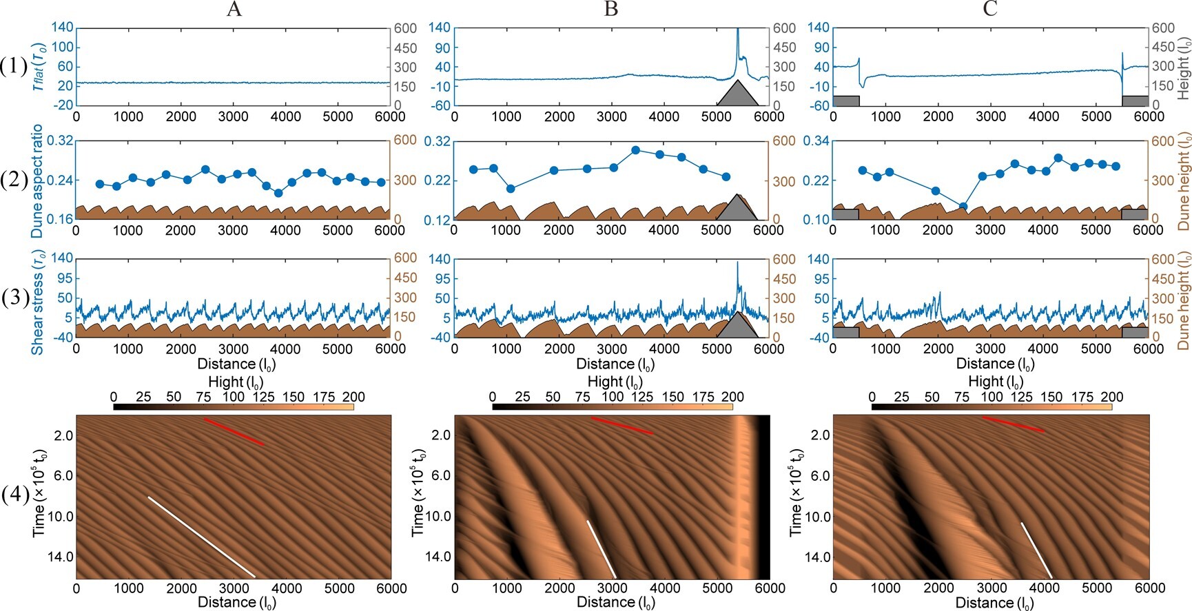 數(shù)值模擬結(jié)果揭示了沙山發(fā)育的核心機(jī)制:平坦地形下沙物質(zhì)均勻分配,抑制高大沙山發(fā)育;山體、盆地等正負(fù)地形引發(fā)剪切應(yīng)力突變,增強(qiáng)沙通量匯聚與沙丘碰撞融合,加速沙丘“粗化”長(zhǎng)高。地形通過持續(xù)塑造風(fēng)場(chǎng)與沙源空間異質(zhì)性,成為高大沙山形成的關(guān)鍵動(dòng)力。