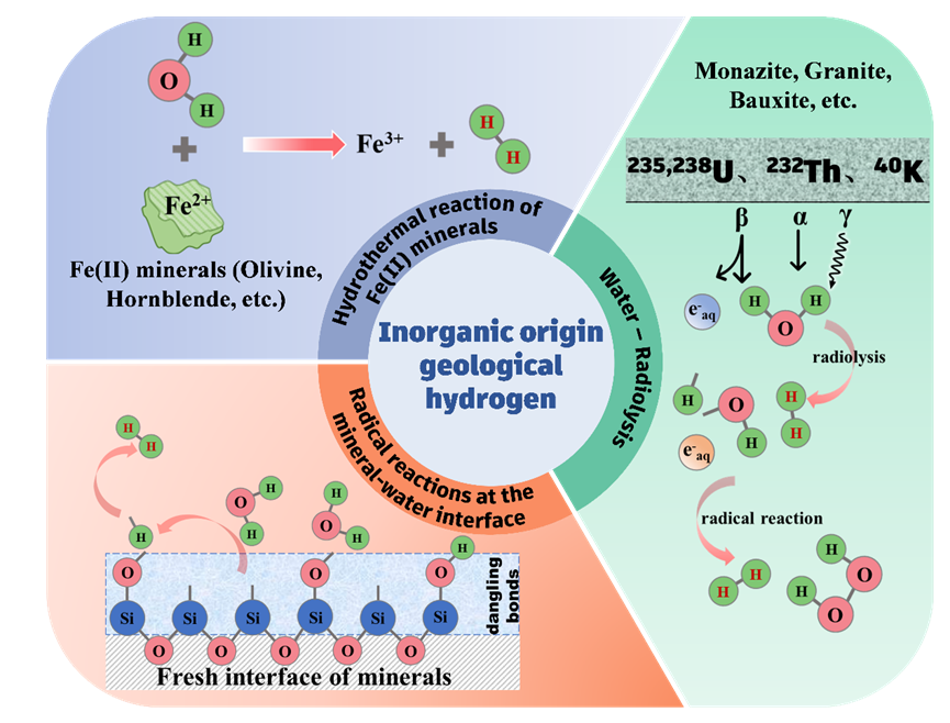 研究指出,含F(xiàn)e(II)礦物水熱反應、水輻射分解以及礦物-水界面自由基反應是無機來源地質(zhì)氫的三種主要形成途徑,其全球年產(chǎn)氫率分別為0.2×1011–6.3×1012 mol/year,1.6×1010–1.35×1013 mol/year,和1.1×108–2.5×1010 mol/year。含F(xiàn)e(Ⅱ)礦物水熱反應的核心機制是Fe(II)的電子轉(zhuǎn)移與礦物相變,主要受溫度控制;水輻射分解則通過天然放射性元素輻照水分解生成氫,主要受輻射類型和劑量影響;而礦物-水界面自由基反應主要來源于界面水分子在不飽和配位位點反應形成自由基并進一步生成氫氣,其主要受礦物類型控制。上述反應還受到共存離子、水溶氣體等地質(zhì)環(huán)境條件的共同調(diào)控。