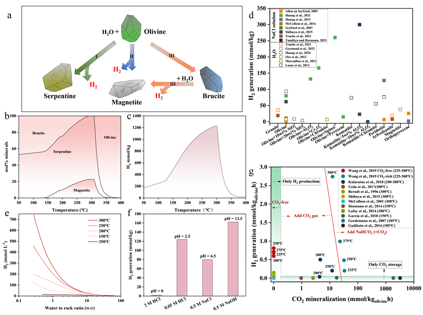 含F(xiàn)e(II)礦物的水熱反應生成氫氣。(a)橄欖石水熱反應生成氫氣的示意圖;(b)在 50 兆帕壓力和水巖比為 1 的條件下,隨著溫度變化預測的橄欖石水熱反應中的平衡礦物組合;(c)在 50 兆帕壓力和水巖比為 1 的條件下,基于熱力學模型計算的橄欖石水熱反應中氫氣生成量隨溫度的變化情況;(d)不同礦物在純水和氯化鈉溶液系統(tǒng)中氫氣生成量的比較;(e)在低水巖比(0.01)條件下,氫氣生成量顯著增加;(f)在不同 pH 條件下,輝長巖熱液反應產(chǎn)生的氫氣;(g)橄欖石熱液反應過程中的氫氣生成及二氧化碳礦化