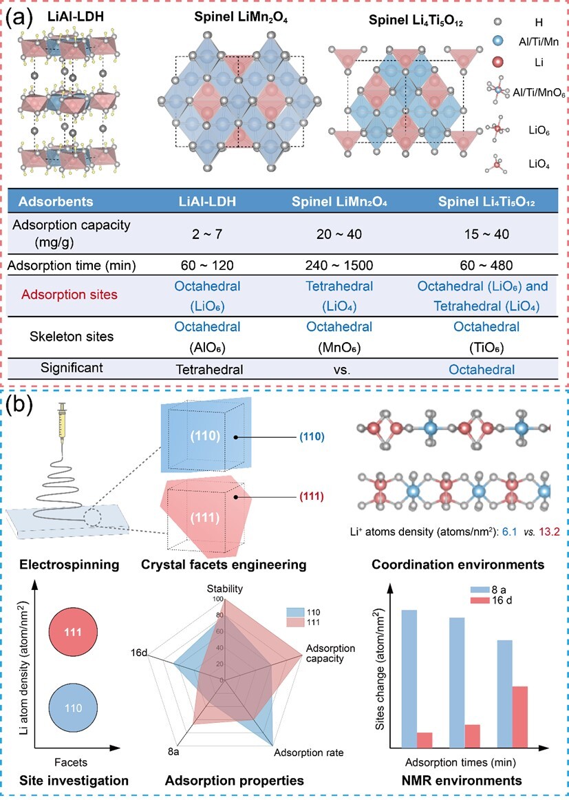 在提高吸附容量方面,研究團隊通過表面配位環(huán)境(coordination environment)的調節(jié)策略,即不同晶面上四面體與八面體配位點分布的精確調控,實現(xiàn)對鋰離子吸附動力學與容量的協(xié)同控制。同時揭示了鋰離子在材料中的遷移機制:鋰離子首先進入四面體位點作為“擴散入口”,隨后逐步遷移至更穩(wěn)定的八面體位點實現(xiàn)儲存。闡明了富含四面體位點的(110)晶面能夠降低鋰離子進入材料結構的能壘,使鋰離子快速進入材料內部,從而顯著提升吸附速率;而具有更均衡配位環(huán)境的(111)晶面則能夠提供更穩(wěn)定的鋰離子儲存位點,從而實現(xiàn)更高的平衡吸附容量。該研究從原子尺度闡明了配位環(huán)境對鋰離子吸附行為的調控機制,為高容量吸附材料設計提供思路。
