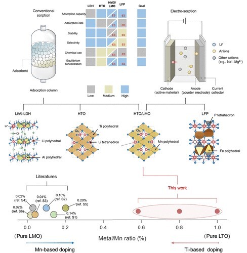 傳統(tǒng)鹽湖提鋰技術依賴太陽能蒸發(fā)濃縮,具有成本低廉優(yōu)勢,但先提鉀后提鋰工藝流程長,各階段鋰夾帶損失大,導致提高鋰收率成為鹽湖資源開發(fā)的急切需求。近年來,電控吸附技術在直接提鋰(Direct Lithium Extraction, DLE)上因其高效、綠色環(huán)保的優(yōu)勢,成為鹽湖資源提取的重要發(fā)展方向。然而,在多離子競爭環(huán)境下實現(xiàn)鋰離子的高選擇性、離子高速傳輸及材料長期穩(wěn)定性,仍是該領域面臨的核心科學問題。針對上述挑戰(zhàn),中國科學院青海鹽湖研究所劉忠研究員帶領的離子吸附科學與技術團隊,長期致力于鹽鹵離子分離材料、工藝、和裝備的系統(tǒng)研發(fā)。團隊在多類吸附材料研究中,鈦吸附劑因離子選擇性高,鈦氧鍵結構穩(wěn)定性好,其工業(yè)化前景十分廣闊。但在實際電控吸附過程中,如何提高離子和電子傳輸,同步實現(xiàn)高吸附容量和高電化學反應速率,仍然是使用過程中面臨的難題。
