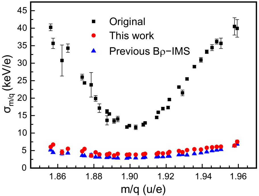 圖:本方法(紅點)與之前Bρ-IMS(藍點)給出的質(zhì)荷比(m/q)標準差的對比。黑點為傳統(tǒng)等時性質(zhì)譜術(shù)(未進行磁場修正)的結(jié)果