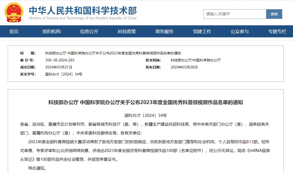 據(jù)悉,2023年度全國科普微視頻大賽共收到各地方各部門推薦和社會機(jī)構(gòu)、個人自薦的作品813部,經(jīng)形式審查、專家評審和公眾評選網(wǎng)絡(luò)投票,評選出2023年度全國優(yōu)秀科普微視頻作品100部。