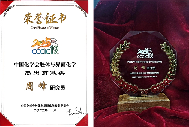 蘭州化物所周峰研究員榮獲中國化學(xué)會(huì)膠體與界面化學(xué)杰出貢獻(xiàn)獎(jiǎng)