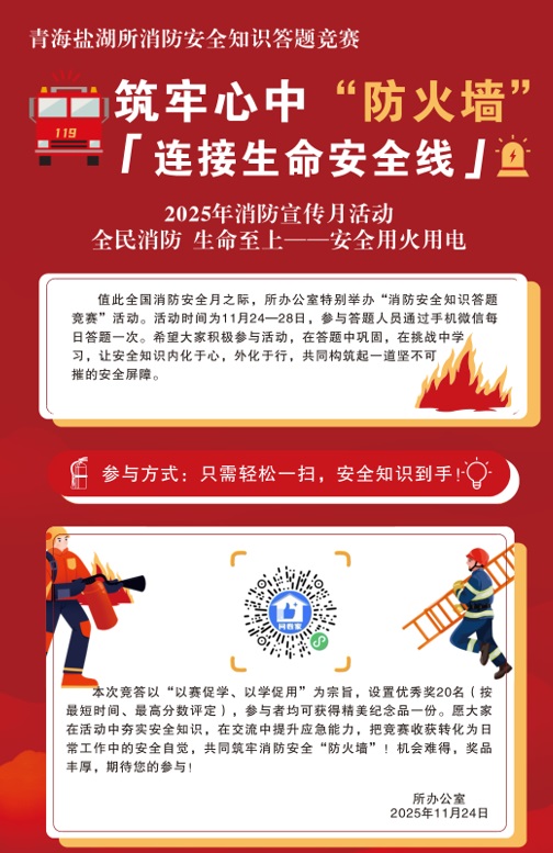 為切實筑牢消防安全防線,提升全員消防安全意識和應(yīng)急處置能力,在全國消防月期間,中國科學(xué)院青海鹽湖研究所創(chuàng)新消防安全教育形式,于11月24日至28日組織開展了線上消防安全知識競答活動,全所100余名職工及學(xué)生通過掃描二維碼參與活動,以賽促學(xué)、以學(xué)促用,營造了濃厚的消防安全學(xué)習(xí)氛圍。