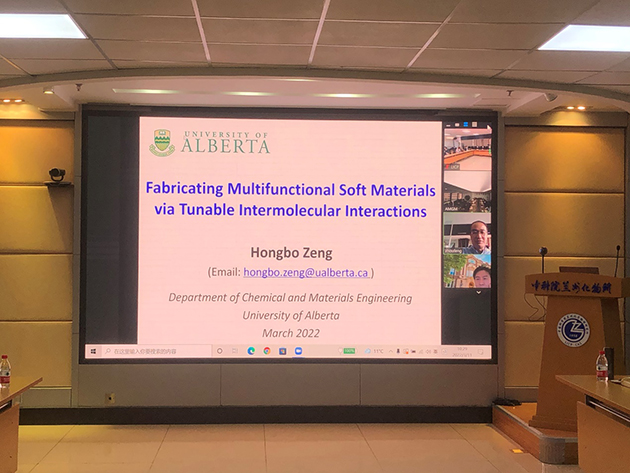 3月11日,中國(guó)科學(xué)院蘭州化學(xué)物理研究所固體潤(rùn)滑國(guó)家重點(diǎn)實(shí)驗(yàn)室邀請(qǐng)加拿大工程院院士、加拿大阿爾伯塔大學(xué)Hongbo Zeng教授作在線學(xué)術(shù)報(bào)告,報(bào)告題目為“Fabricating Multifunctional Soft Materials via Tunable Intermolecular Interactions”。報(bào)告由副所長(zhǎng)周峰研究員主持,相關(guān)領(lǐng)域科研人員100余人參加了報(bào)告會(huì)。