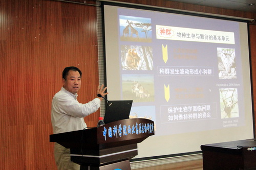 本次論壇共安排11個(gè)特邀報(bào)告。中國科學(xué)院院士、中國科學(xué)院水生生物研究所研究員桂建芳,中國科學(xué)院動(dòng)物研究所研究員蔣志剛、王德華、雷富民、杜衛(wèi)國、詹祥江,西北大學(xué)教授李保國、中國科學(xué)院昆明動(dòng)物研究所研究員施鵬、東北林業(yè)大學(xué)教授張明海、山東大學(xué)教授李玉春、西北高原所研究員楊其恩分別作了題為“多倍體銀鯽及其復(fù)合種的生態(tài)分布格局與演化歷史”、“未雨綢繆、亡羊補(bǔ)牢:量化中國哺乳動(dòng)物滅絕風(fēng)險(xiǎn)”、“生理生態(tài)學(xué)與動(dòng)物保護(hù):學(xué)科地位與發(fā)展的思考”、“應(yīng)對(duì)第四紀(jì)冰期和氣溫變化的鳥類譜系地理學(xué)過程”、“生態(tài)生理學(xué)與保護(hù):以爬行動(dòng)物溫度響應(yīng)為例”、“Reference genome, population genetics and population genomics of wild falcons”、“環(huán)境變化下的秦嶺金絲猴社群結(jié)構(gòu)”、“基因組時(shí)代下的生物多樣性資源挖掘”、“基于糞便分子生物學(xué)及3S技術(shù)的馬鹿家域研究”、“我國小型哺乳動(dòng)物物種多樣性的低估與保護(hù)迫切性”和“配子體外生產(chǎn)技術(shù)在畜牧生產(chǎn)和野生動(dòng)物保護(hù)中的應(yīng)用潛力和挑戰(zhàn)”的報(bào)告。精彩絕倫的報(bào)告引起了與會(huì)代表的極大興趣,大家認(rèn)真傾聽、踴躍發(fā)言,展開了熱烈的交流與討論,現(xiàn)場氣氛異常活躍。