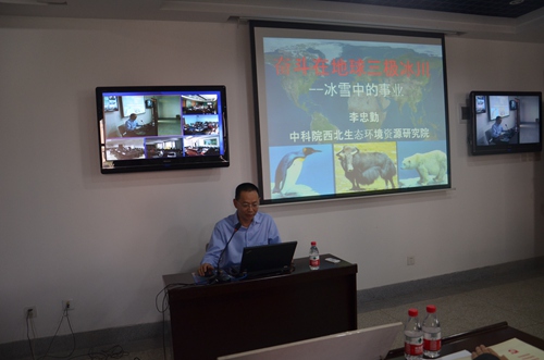 李忠勤結合自己在高寒極端環(huán)境無私奉獻30年的難忘工作經(jīng)歷,為與會人員深情講述了他《奮斗在地球三極冰川》的感人故事。他的報告分“北極科學考察介紹”、“走進南極”和“中國冰川定位觀測”三個部分,通過普及地球三極(南極、北極和青藏高原)知識、梳理回顧世界及中國冰川科考歷史、介紹中國冰川科考站情況及科考隊感人事跡,為大家作了一場生動、感人的報告,一幅幅珍貴難得的實地照片再現(xiàn)了冰川科考工作的極端艱辛,一句句深情感人的樸實語言展示了共產(chǎn)黨人無私奉獻的政治品格。同時,他強調(diào)指出,他所在的科研團隊結合冰凍圈科學研究以野外工作為基礎,具有人員分散、工作辛苦等特點的實際,制定了以黨小組為單元,研究室支部、所黨委聯(lián)動的“兩學一做”方案,以科研工作為載體和抓手,深入扎實推進“兩學一做”學習教育,取得了良好效果,發(fā)揮了黨支部是戰(zhàn)斗堡壘作用。他的報告圖文并茂,真實感人,既是一場科普報告,更是一場生動黨課,受到與會人員歡迎和好評。